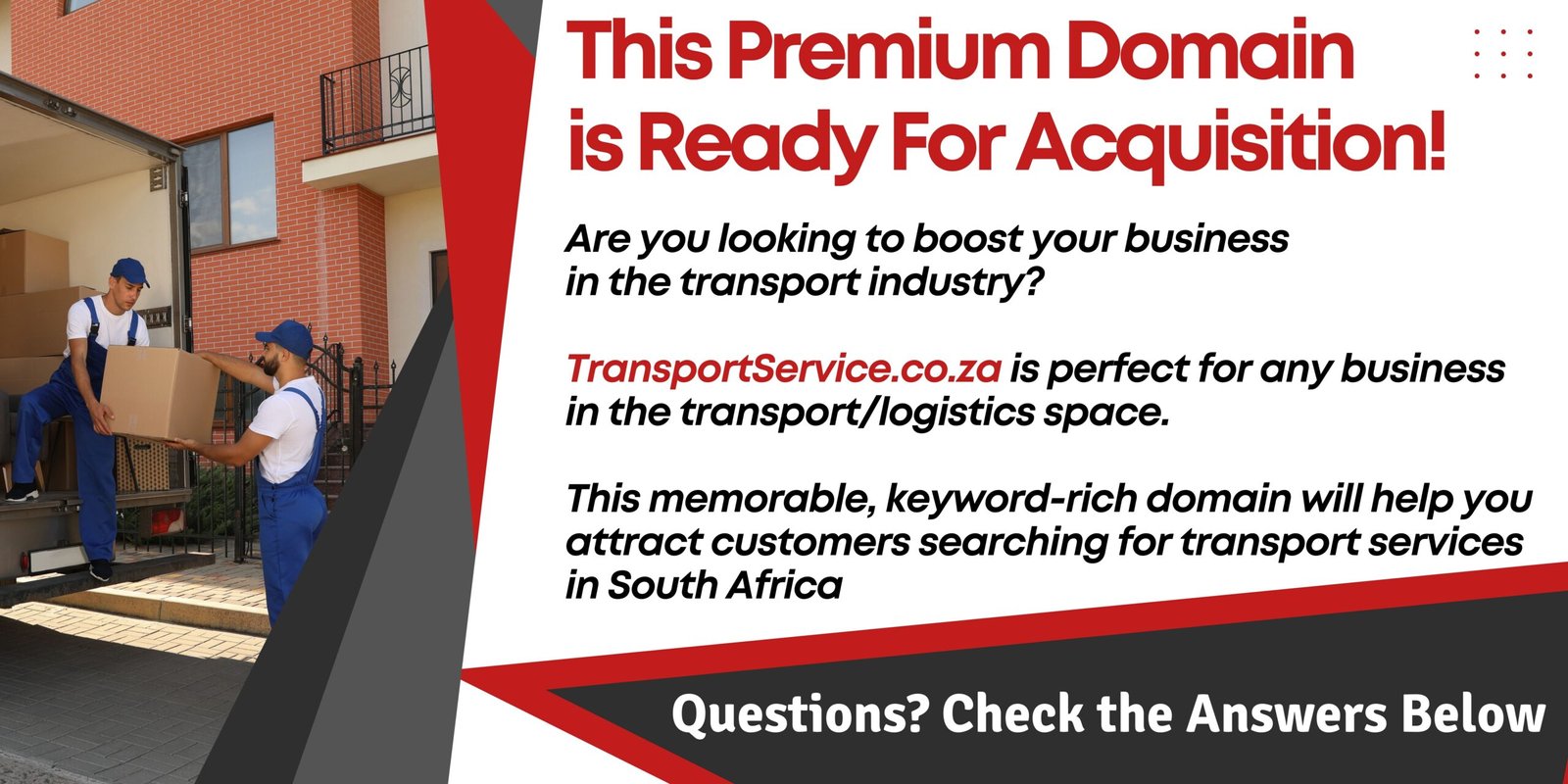 TransportService.co.za is a premium domain name that is available for acquisition. It is ideal for businesses, entrepreneurs, and logistics enthusiasts looking to establish a strong online presence in the South African transport/logistics industry.
